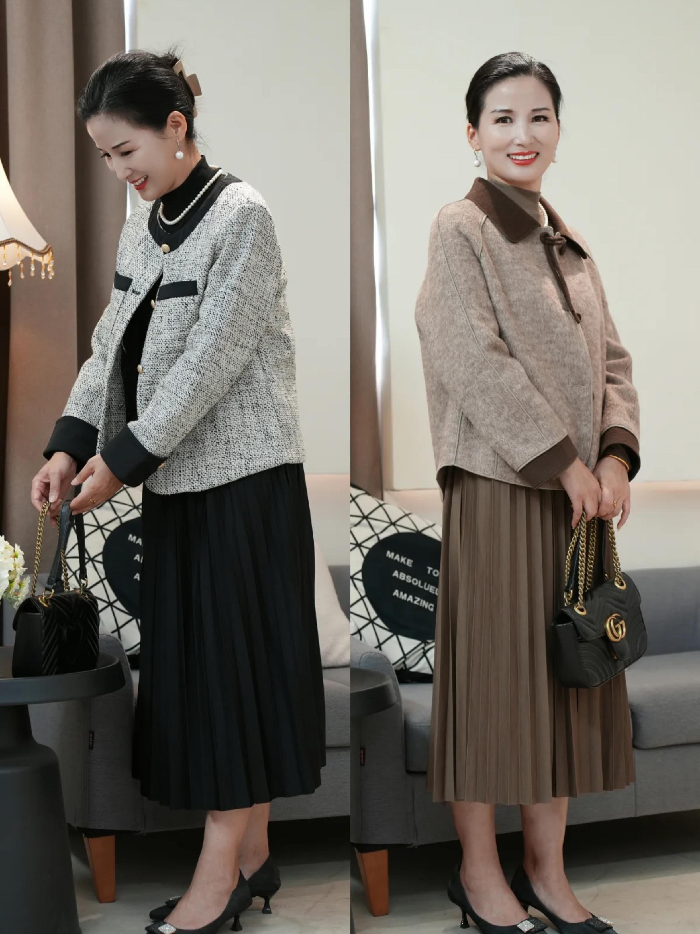 秋天裏的百褶半身裙,也是非常實用的單品。大齡女性就選擇一些暗色系吧,比如黑色、棕色的百褶半身裙,就格外的優雅顯瘦。