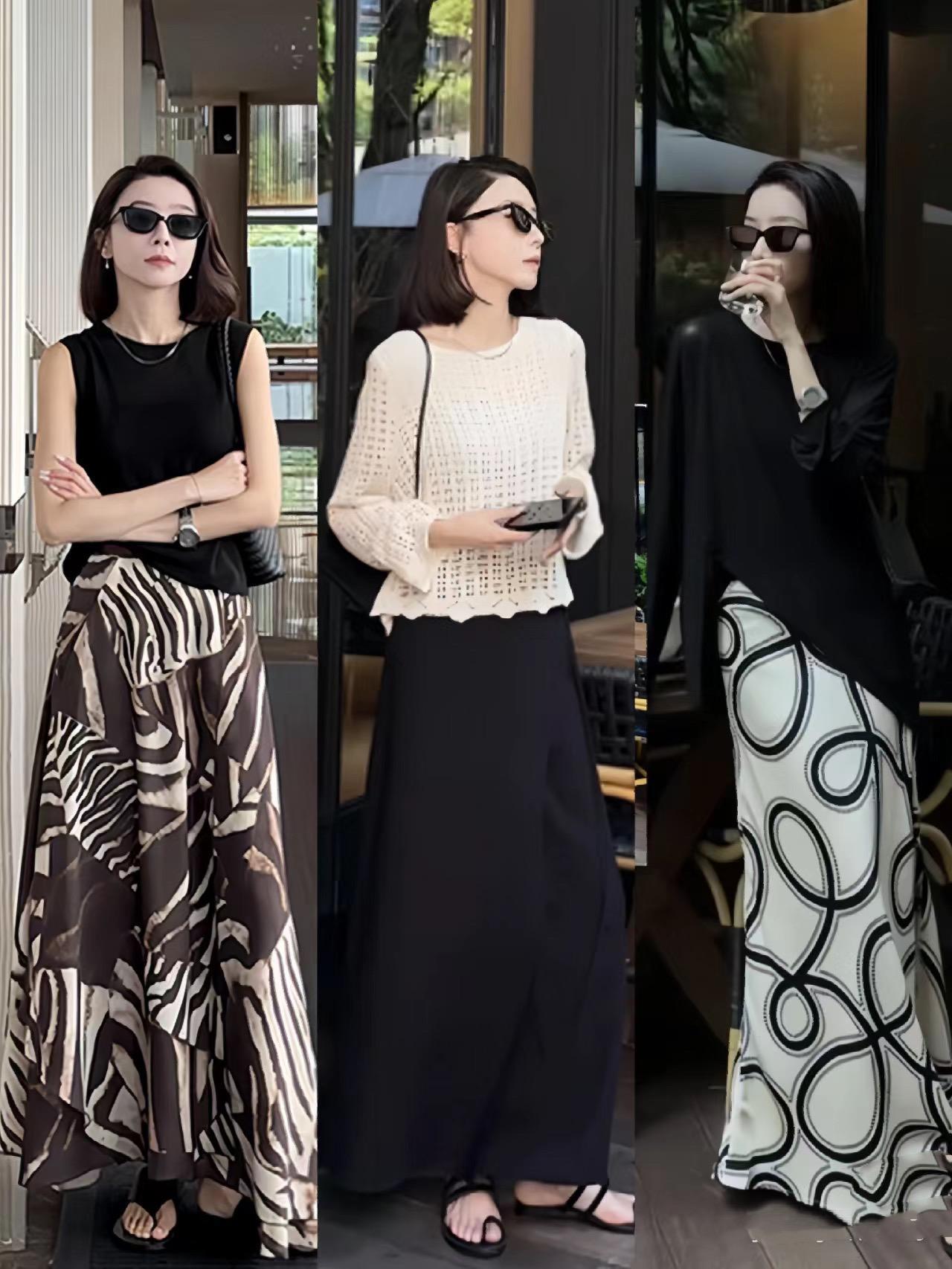 秋天裏的長裙,儘量選擇一種過膝的長度。裙襬越長,就越能適應秋冬的天氣。這種過膝的長裙,除了可以選擇純色系,還可以搭配印花款式。