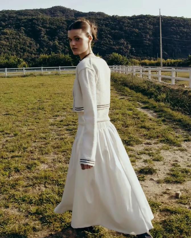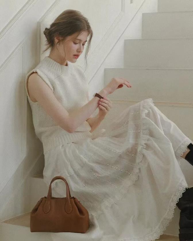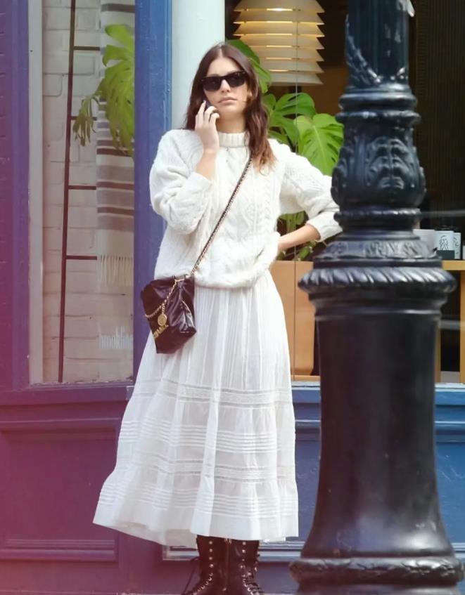當你不知道該怎麼去配色的時候,利用起同色系就沒錯了,奶白色的麻花毛衣,這個色調瞧着也太溫柔了,很百搭,選擇一條白色半身長裙,有種剛柔並濟的美感,又輕鬆穿出鬆弛感,出門搭配一個簡簡單單的包包,方便又出衆。