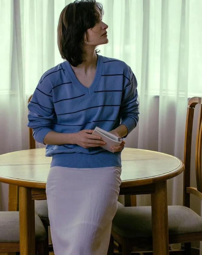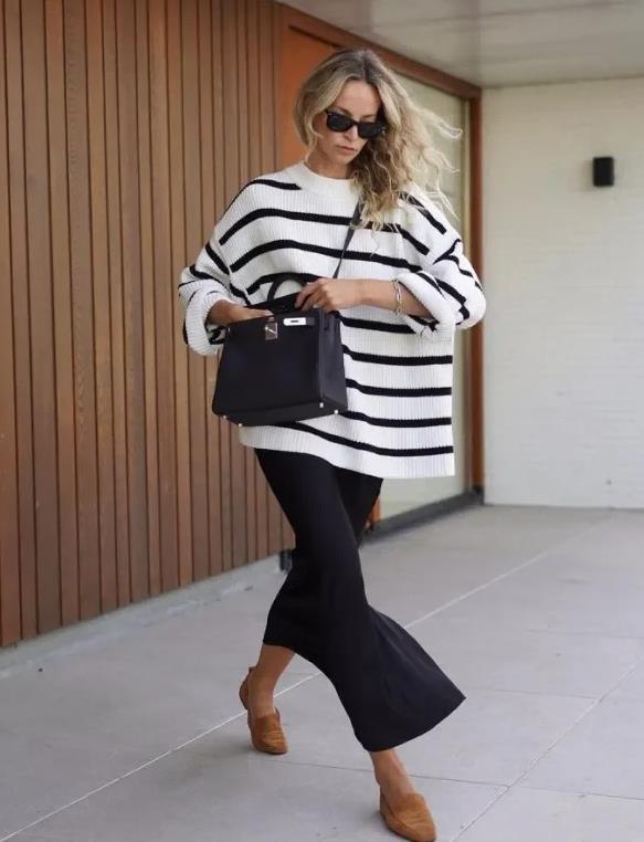 如果你覺得純色系的毛衣看起來比較單調的話,可以試試這種藍色條紋針織衫,下身配着一條半身長裙,上繁下簡的結合,增加層次感的同時,又很時髦。由內到外散發出自信和優雅,整個着裝打扮看起來隨性又舒適,早秋季節,就這麼穿吧,有種很鬆弛的浪漫。