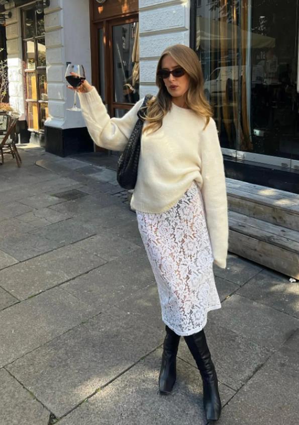 喜歡這種顏色淡雅,軟軟糯糯材質的針織衫,套頭設計,穿脫都十分方便,選擇一條白色蕾絲半裙來配,毫不費力就展現出時髦,優雅中又透着幾分漫不經心的高級,再加上一雙黑色靴子,完全滿足都市女性的穿搭需求。