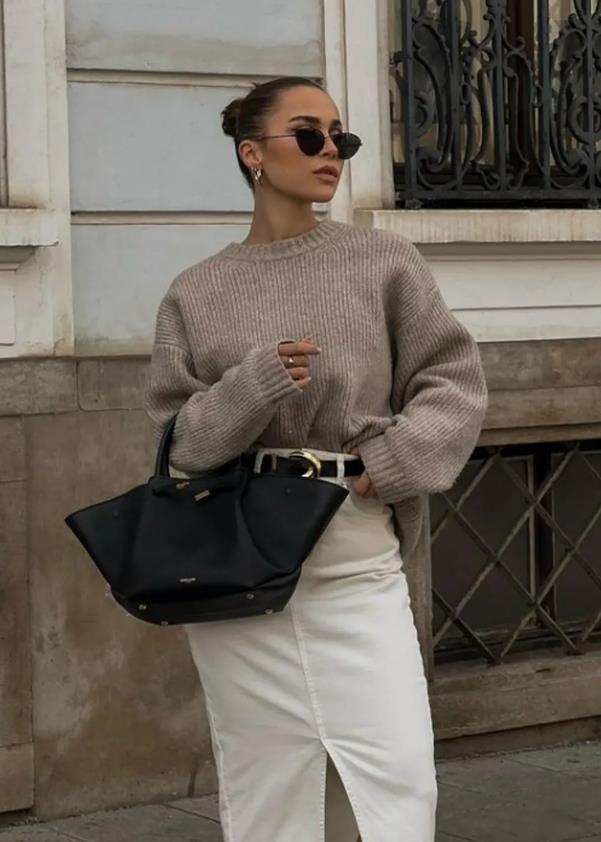 針織衫和半裙的組合,可是最適合秋天的,灰色套頭針織衫搭配白色牛仔開叉半裙,這種開叉設計的裙子,上身後能輕鬆拉長腿部線條,視覺上也非常顯瘦。記得把上衣塞進裙子裏面,輕鬆營造出鬆弛、休閒的狀態。