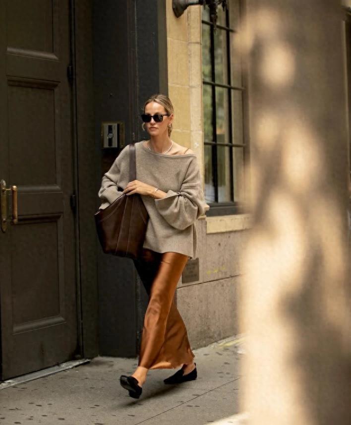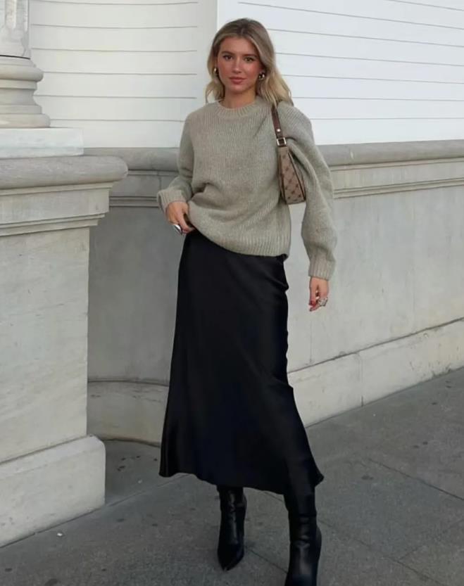 灰色的毛衣針織衫,搭配黑色真絲半身長裙,能輕鬆將屬於女性的時尚和魅力盡顯出來,這樣的着裝看起來不僅休閒,還透着氣質感。可以讓整個着裝看起來更時髦個性,腳下配上一雙黑色高跟靴子,輕鬆打造出個人氣場。