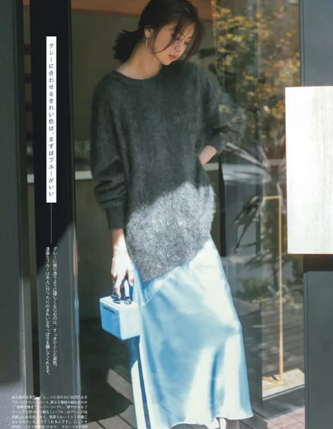 馬海毛材質的針織衫,貼身穿都無懼,很親膚柔軟,這件黑色馬海毛毛衣,偏寬鬆的版型,可藏肉顯瘦了,也能輕鬆穿出隨性感。搭配一條藍色緞面半身長裙來配,有種很別緻的美感,也將女性的柔美呈現出來,鬆弛且不失高級。