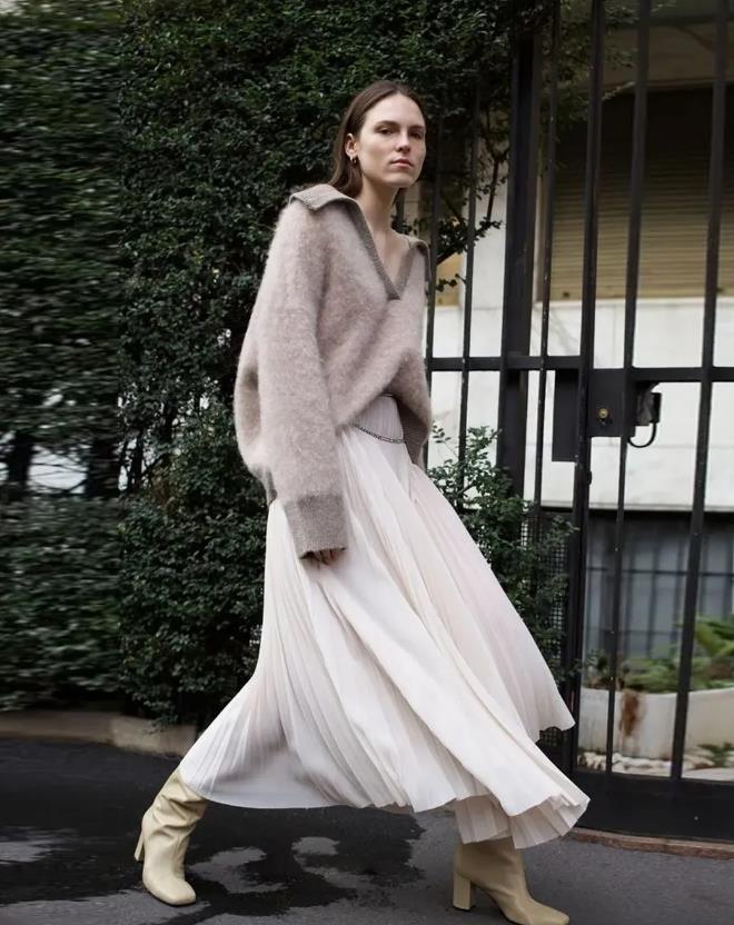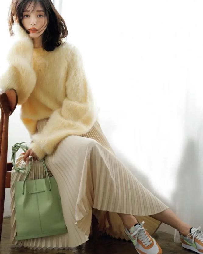 馬海毛設計的針織衫,光看着都覺得很軟糯,下身配一條杏色百褶半裙,很是優雅和溫柔,當然了,因爲針織衫和裙子的版型偏寬鬆,所以組合在一起,就會給人一種隨性範,不管是上班,還是逛街休閒都很合適。