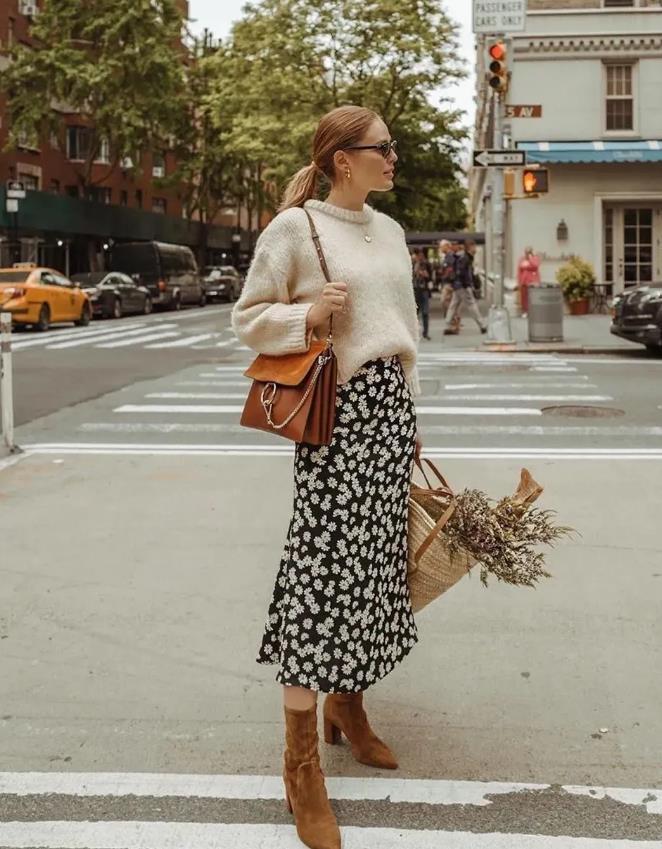 白色套頭針織衫配黑色碎花半身長裙,這一套遵循了上簡下繁的組合,真的很美和浪漫,有些偏復古的絞花毛衣,與碎花半裙結合,既不失高雅氣質,還能在無形間散發出魅力,腳下踩着一雙短靴就可以了。