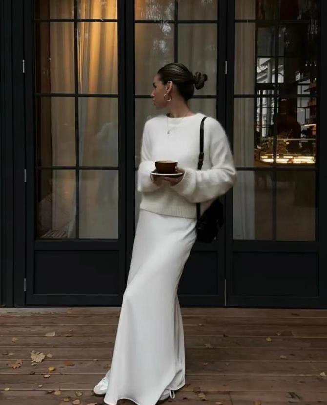 一身白色系的打扮,看起來也太高級了,馬海毛針織衫+白色緞面半裙,過腳踝的長度,優雅感十足,這一套結合了中性與柔美氣質,搭配一雙運動鞋,自在舒適又好看。