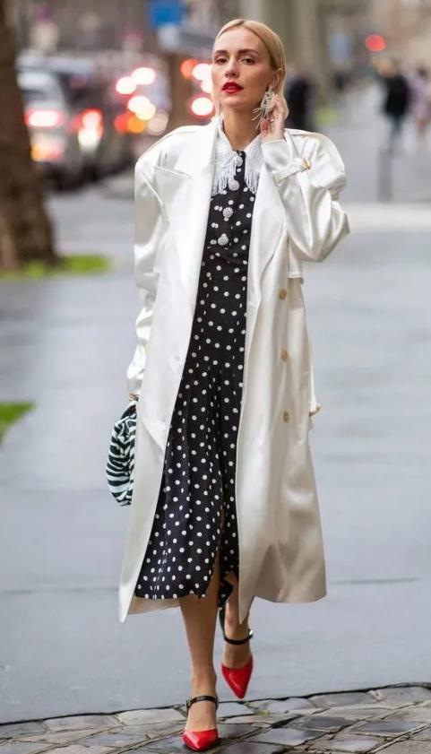 白色緞面的風衣外套,大概很多女性們都沒有嘗試過吧?質感看起來也太好了,內搭黑白波點連衣裙,都是寬鬆的版型,看起來也太顯慵懶和隨性了,腳下踩着一雙紅色高跟鞋,視覺上也變得高挑起來了。