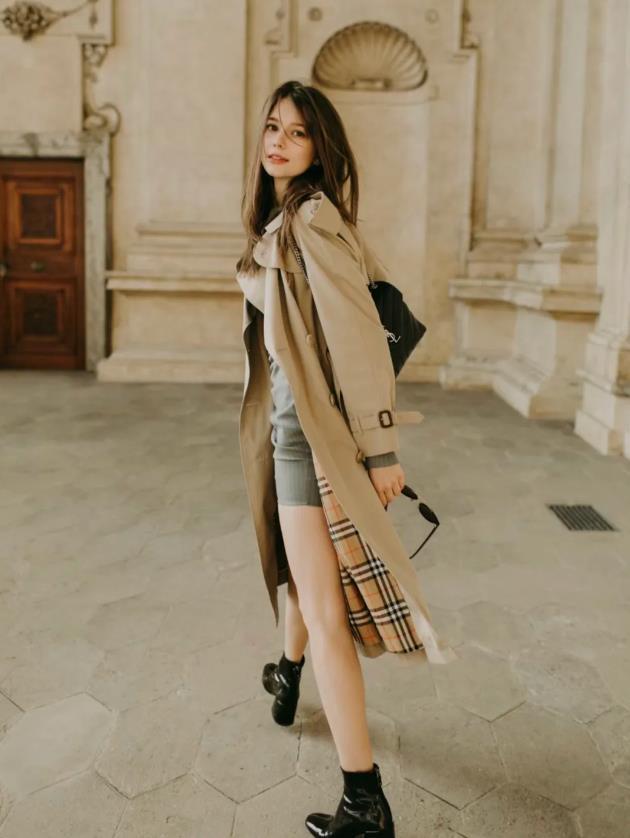 灰色針織短裙配卡其色長款風衣,鞋子選擇一雙黑色及踝靴,這樣的穿法可以在視覺上拉長腿部線條,也不失高挑。讓你穿出剛柔並濟感,知性氣質還不失女性的柔情,適合各種場合的着裝。