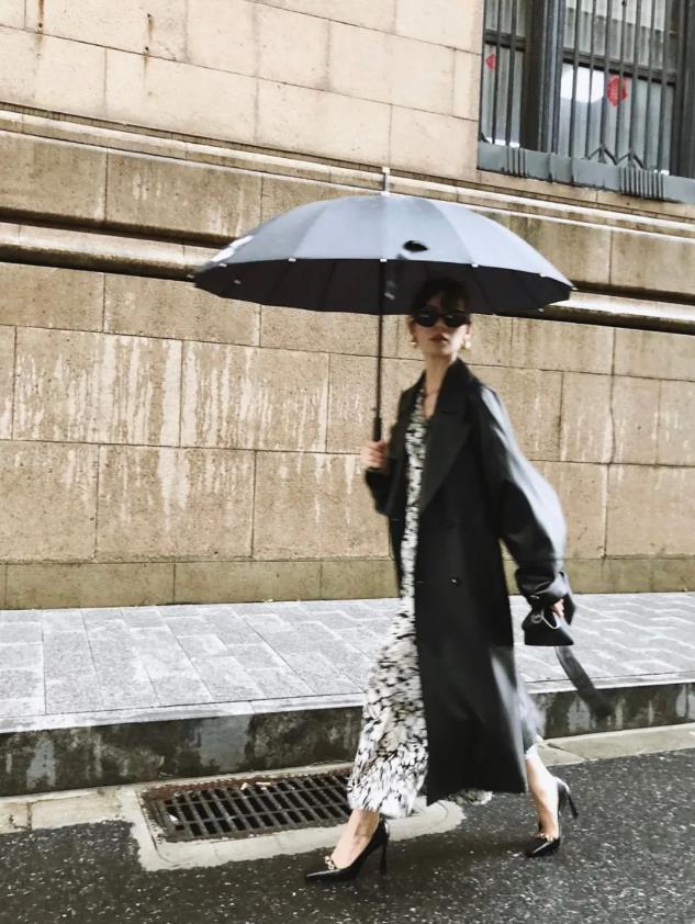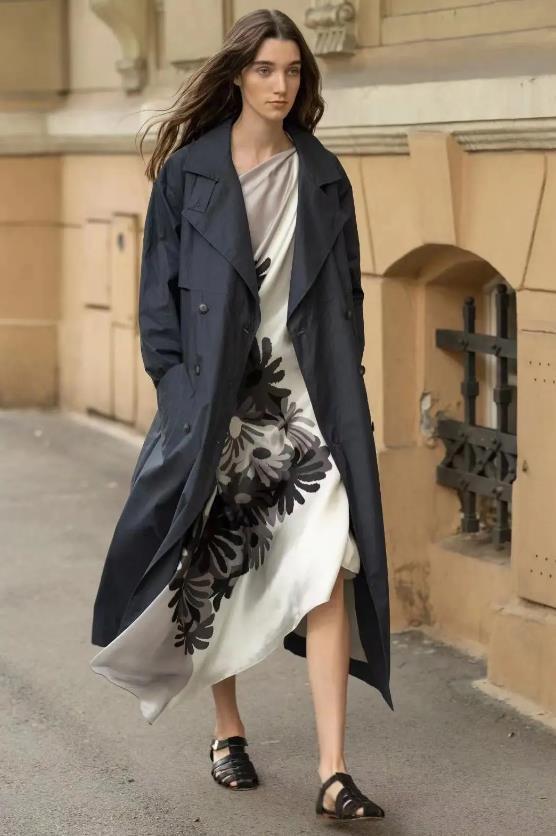 印花緞面連衣裙+黑色長款風衣,又颯又不失溫柔,這樣的穿搭能夠恰到好處展現出隨性與高級,腳下踩着一雙涼拖鞋,瞬間打造出屬於大女人的知性和大方,同時也不失利落感。