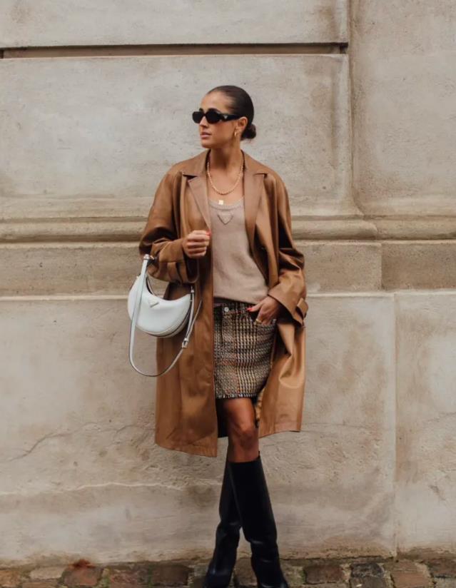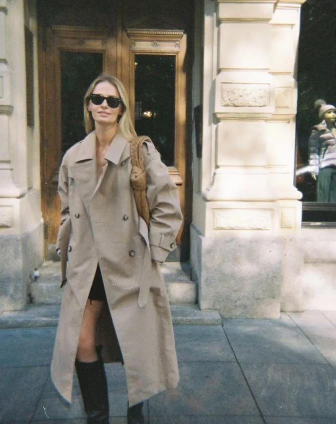 淺卡其色的風衣外套,與黑色牛仔短裙的結合,表達了一種女性的獨立和自信,再配上一雙長靴後,又將屬於大女人的柔美和帥氣展現出來,頗有魅力的一套。