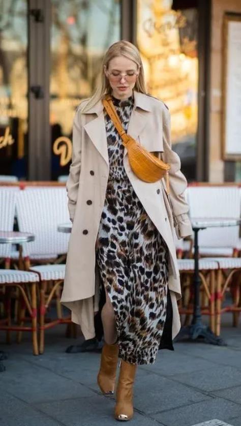 豹紋連衣裙,是帶着一種野性美感的,與純色風衣相配,既不失高級還帶着幾分隨性的美感,搭配一雙靴子,就能營造出幹練利落感,簡約卻不失簡單的造型。