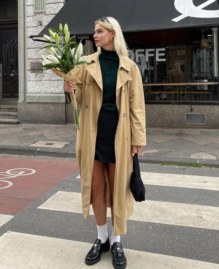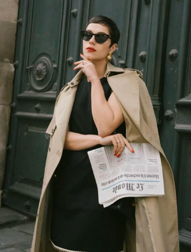 卡其色的風衣,可是最經典百搭的,當它與黑色裙子組合一起的時候,真的是太顯時髦和高級了,不管是裙子,還是風衣,對身材的包容性都非常強,可以穿出高級大方的既視感,搭配一對金屬耳環裝飾,瞬間就將屬於女性的自信呈現出來,精緻感拉滿。