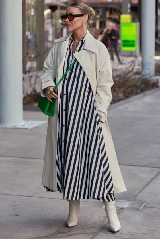 條紋襯衫連衣裙+風衣,遵循了一簡一繁的結合,輕鬆打造出屬於女性的魅力,整個着裝又颯又不失利落,讓人看起來非常高級,搭配一雙白色靴子,還有綠色的包包,也對整個造型進行了點綴。