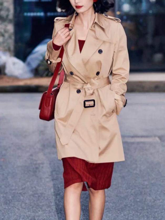 卡其色風衣搭配白色半身長裙,將大女人的氣場打造出來了,不失休閒又充滿自信的着裝,既不失幹練又很顯魅力,腰間繫着一根腰帶,修飾了整個身材比例,太顯瘦了。