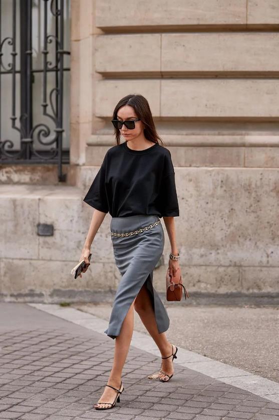 灰色開衩半裙,這種裙子的設計,穿起來後就能很好拉長腿部線條,選擇一件黑色寬鬆短袖t恤來配,黑灰的配色組合,實在是太高級了,不失氣質又充滿了魅力。搭配一雙黑色細帶涼鞋,看着簡簡單單的搭配,卻讓人看起來很顯氣場。