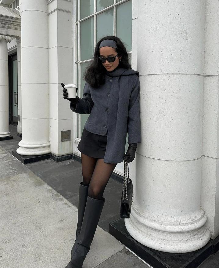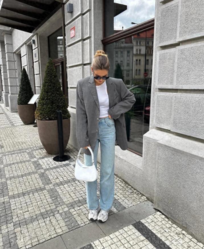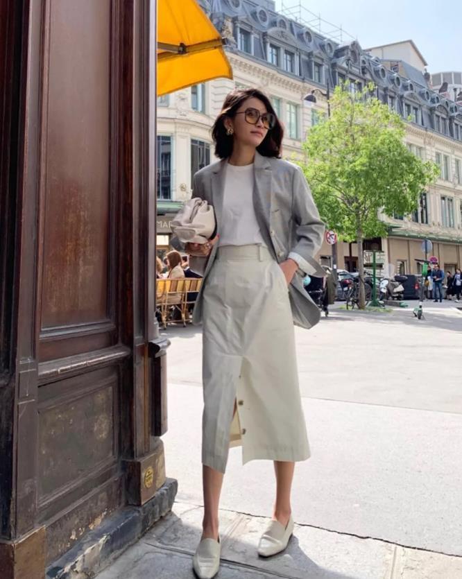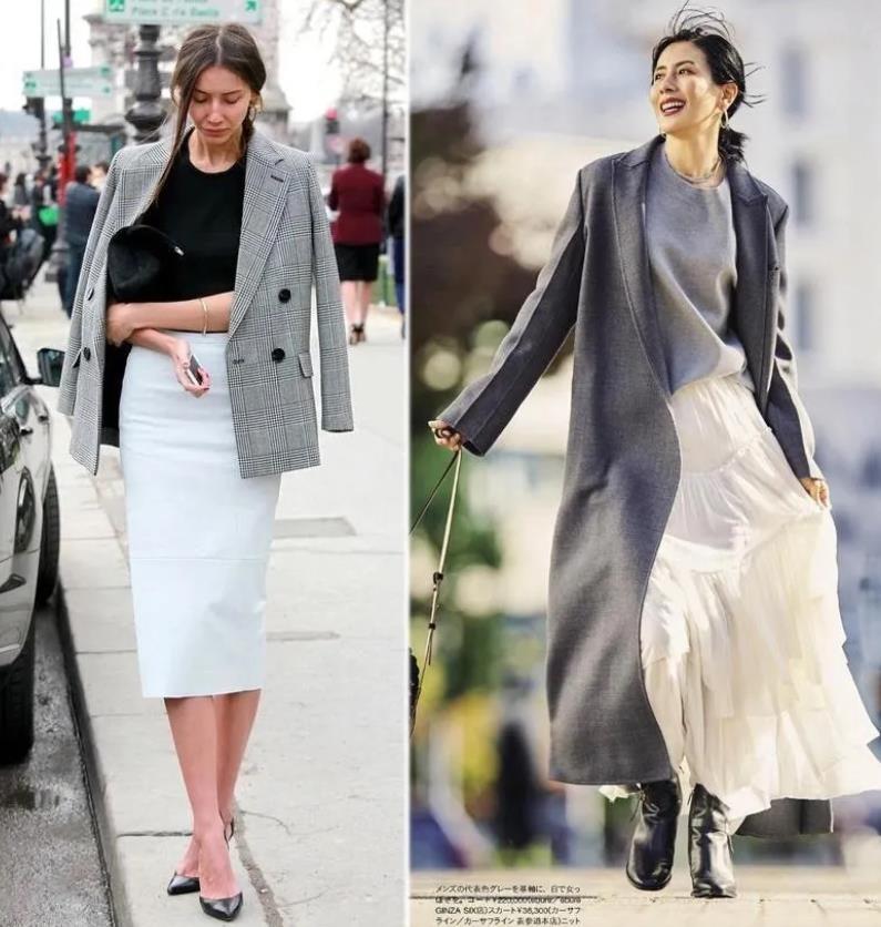 灰色西裝外套+白色半身長裙,毫不費力就穿出高級感,西裝這種單品,本來就是比較顯嚴謹和幹練的,也很大氣,與裙子組合一起後,有種剛柔並濟的既視感,搭配一雙平底鞋,或者是靴子,又打造出一種又美又颯的效果。