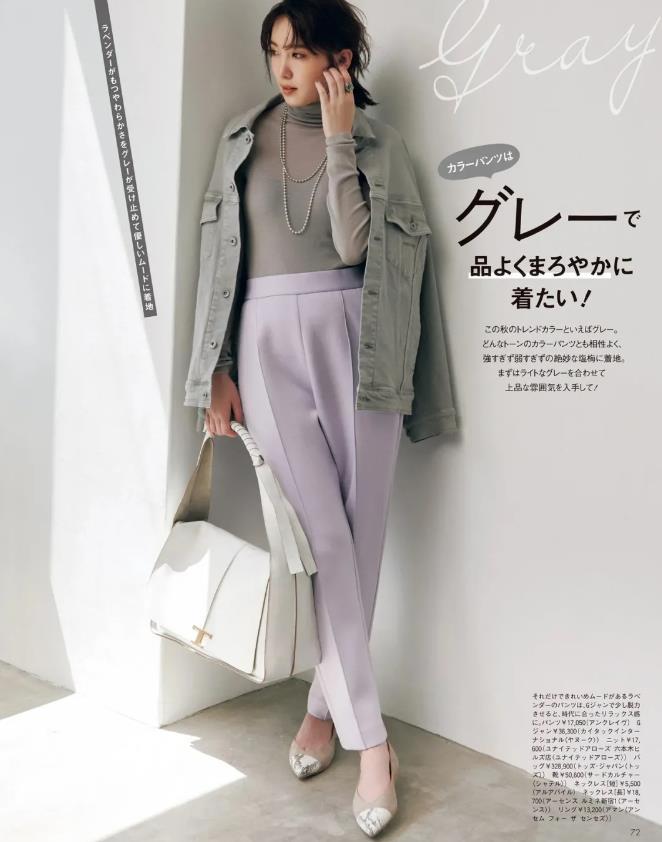 灰色打底衫+同色牛仔外套,和諧度滿滿的一套,穿搭也運用了鬆緊結合,下身搭配淺紫色直筒褲,不失幹練利落又充滿個性,記得要佩戴一條項鍊,這樣就很好提升整個造型的魅力,腳下搭配一雙尖頭平底鞋,很不失個人品味和風格。