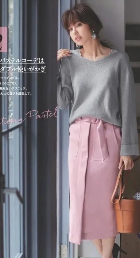 灰色是很百搭的色調,與任何一種顏色組合,都是不會出錯的,灰色毛衣搭配粉色半身長裙,能增強整個造型氣場,也彰顯出穿搭的功力,稍微將毛衣塞進裙子裏面,提高腰線比例,也不失魅力,而且,灰粉色搭配也是很顯氣場的。