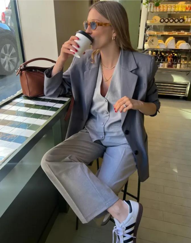 灰色馬甲配灰色西裝外套,同色系的組合,瞧着也太高級了吧,能將成熟女性的魅力呈現出來,很高級大氣。搭配一雙運動鞋,瞬間就多了幾分休閒氣息,也彰顯出女性的獨立自信和魅力。