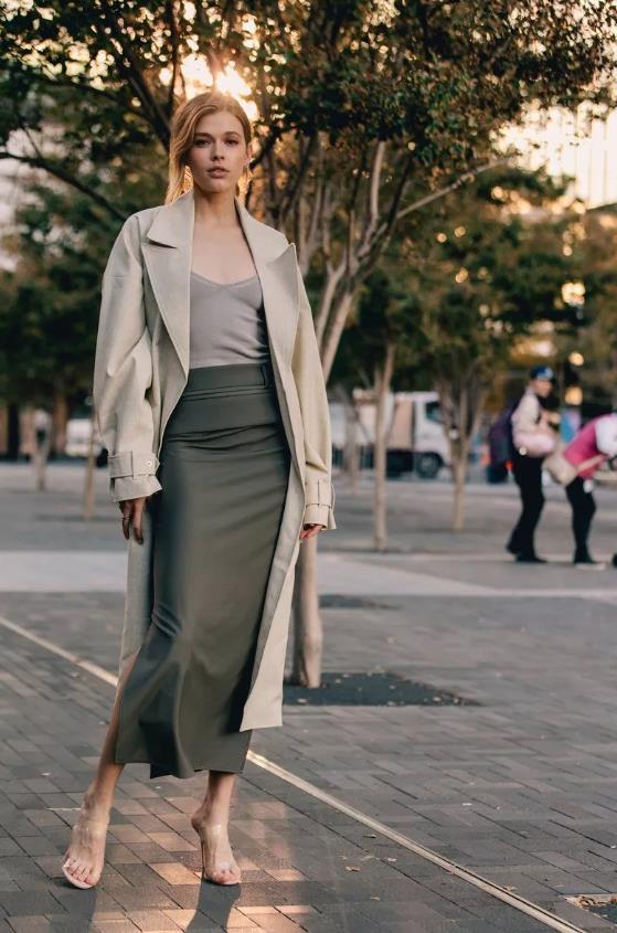 裙子的顏色,你可不要只入手經典黑,其實你也可以嘗試下這種深灰,搭配淺灰色的t恤,整個着裝看起來很簡約大氣,外面再疊穿一件灰色風衣,就這麼敞開來穿,毫不費力就營造出女性的高級和氣場,再搭配一雙高跟鞋,盡顯大女人風範。