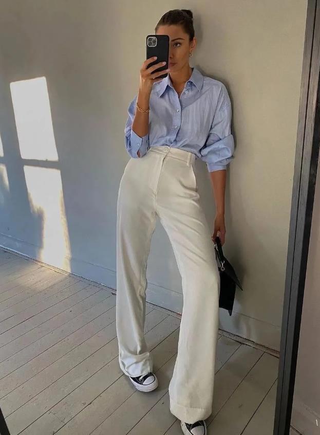喜歡藍色的襯衫,因爲這個色調實在是太襯膚色和顯白了,記得不要將衣領的扣子全部系起來,露出一點鎖骨肌膚,這樣才能在視覺上拉長整個身材比例。選擇白色高腰闊腿褲,很顯幹練和清爽,將襯衫下襬塞進褲子裏面,顯得幹練利落,又能拉長腿部線條,配上一雙帆布鞋後,就又多了幾分舒適。