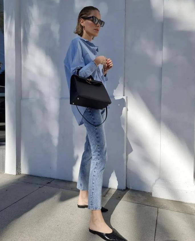 低飽和度的藍色襯衫,對膚色一點違和感都沒有,黃黑皮都能hold住的膚色,搭配一條藍色牛仔褲,就可以穿出一種既休閒又高級的風格了。腳下搭配一雙白色芭蕾平底鞋,這樣的裝扮,帶着幾分隨性和自信。