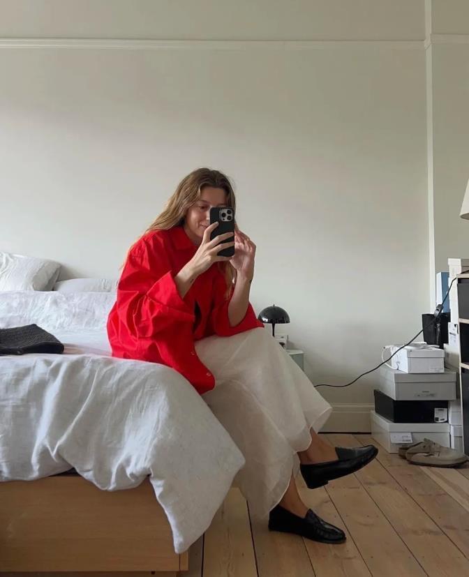 明豔的紅色,真的是無論在什麼時候都不會過時,只不過這個顏色並不是那麼容易駕馭的,寬鬆版型的紅色襯衫,對身材是一點約束感都沒有。與白色半身長裙組合一起,有種漫不經心的休閒和隨性,搭配一雙黑色樂福鞋,恰到好處展現出簡約和舒適,也將大女人的風範呈現出來了。