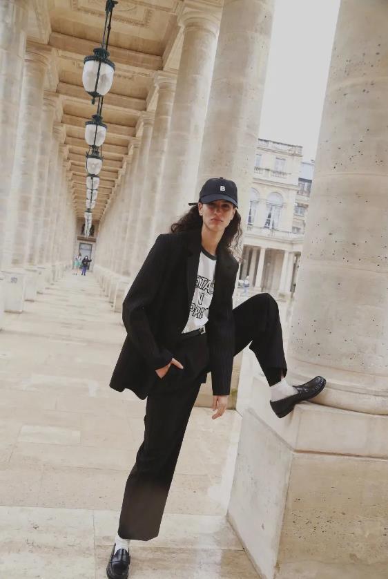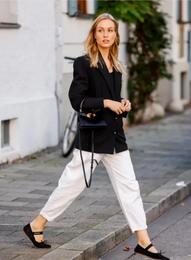 黑色的西裝外套,可是最顯經典和百搭的,也非常不挑人,寬度適中的版型,讓你穿得舒適自在,還非常顯瘦。內搭一件黑色打底衫,視覺上看起來就很瘦身,與白色闊腿褲組合,盡情展現出休閒和隨性,再搭配一雙黑色芭蕾鞋,溫柔又舒適。