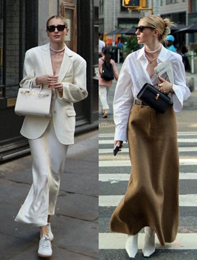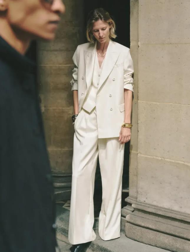 一身溫柔的白色西裝套裝,西裝裏面還疊穿了一件同色馬甲,整個着裝瞧着也太不失個人魅力了,將現代的高級感呈現出來。下身搭配一條同色闊腿褲,穿上一雙黑色樂福鞋,恰到好處展現出利落又時髦。