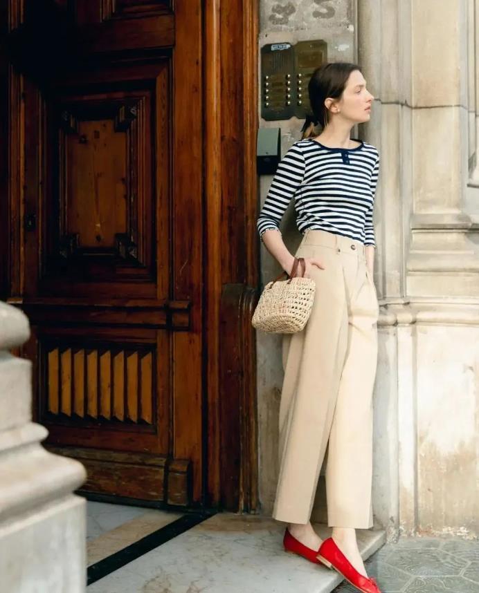 若你厭倦了純色系的t恤,那麼就一定要試試這種條紋長袖t恤,搭配一條高腰卡其色闊腿褲,寬鬆的褲型,可太藏肉顯瘦了。這樣的搭配看起來自帶鬆弛和舒適感,再選擇一雙黑色芭蕾鞋,既溫柔氣質,還非常舒適。