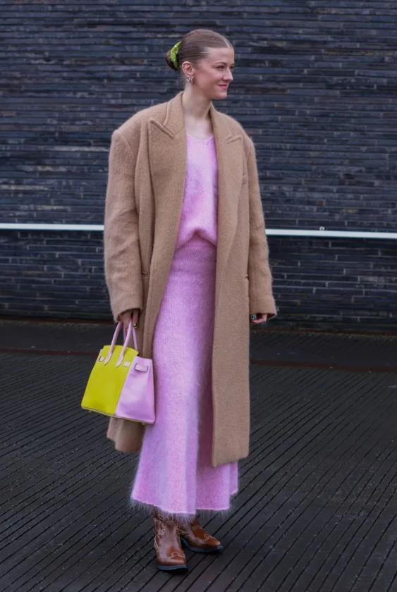 應對寒冷冬天,出門沒有一件大衣怎行?卡其色的長款大衣,內搭一件紫色針織套裝裙,無時無刻將女性的優雅大氣呈現出來,很不失魅力的一套,搭配一雙咖色靴子,簡約還不失氣質,整個着裝看起來幹練利落又不失氣場。