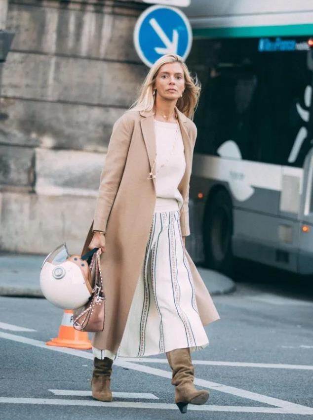就問,在秋冬季節,有誰可以拒絕卡其色大衣的呢?內搭一件白色針織衫,與卡其色組合一起,也太不失溫柔氣質了吧?搭配一條半身長裙,不僅耐看還能打造出利落感,選擇一雙咖色靴子,整個着裝透着幾分知性和魅力。