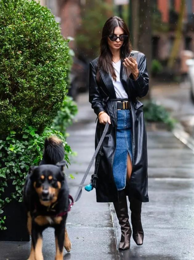 黑色皮質大衣外套,就這麼敞開來穿,個人的氣場直接給拉滿了,內搭簡單配一件白色T恤,既不失休閒範,又能穿出颯爽的感覺,搭配一條牛仔半身長裙,讓你輕鬆穿出自信和魅力,內搭的衣角塞進褲子裏面,爲整個造型增添幾分利落,一雙黑色靴子,就能讓整個造型看起來魅力無限了。