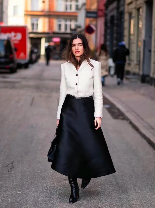 白色的小外套,看起來就特別溫柔氣質,搭配一條黑色半身長裙,輕鬆彰顯出女性的獨立與自信,將其塞進裙子裏面,提高了腰線比例,搭配一雙黑色靴子,與黑色裙子進行了呼應,很好拉長了下身比例線條,絕了。