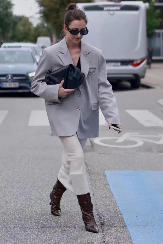 不知從什麼時候開始,西裝外套再也不是職場的專屬,它成爲了很多潮人博主們的穿搭首選,寬鬆版型的灰色西裝外套,搭配白色半身長裙,既不失氣質感,又能穿出隨性自在的範,選擇一雙深咖色靴子來配,呈現出一種自在瀟灑的造型。