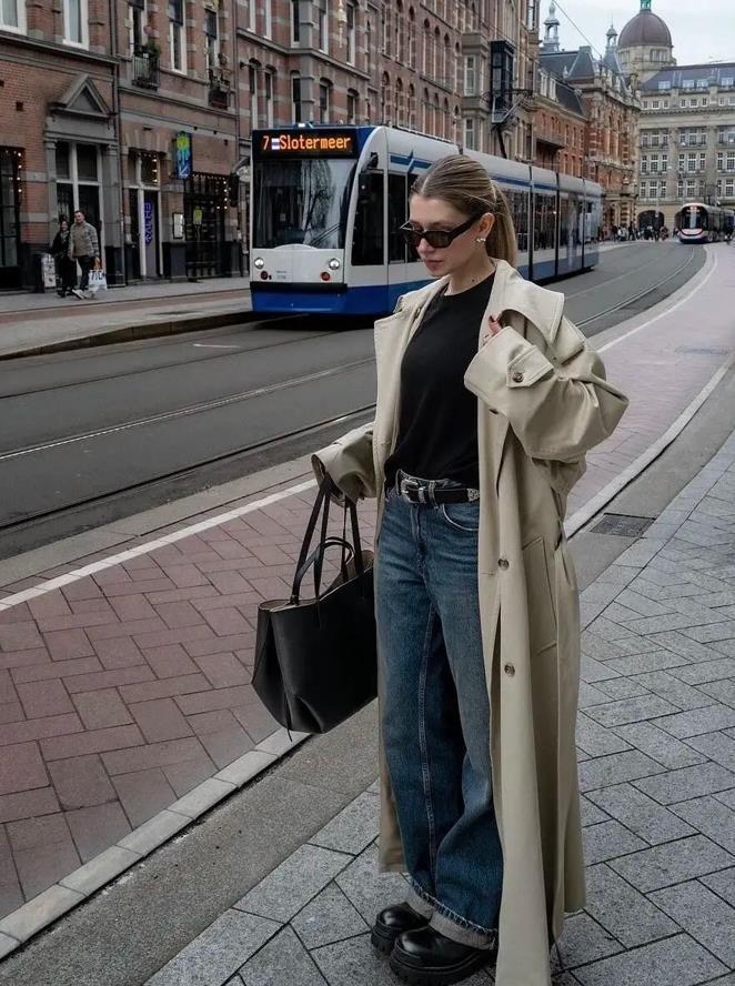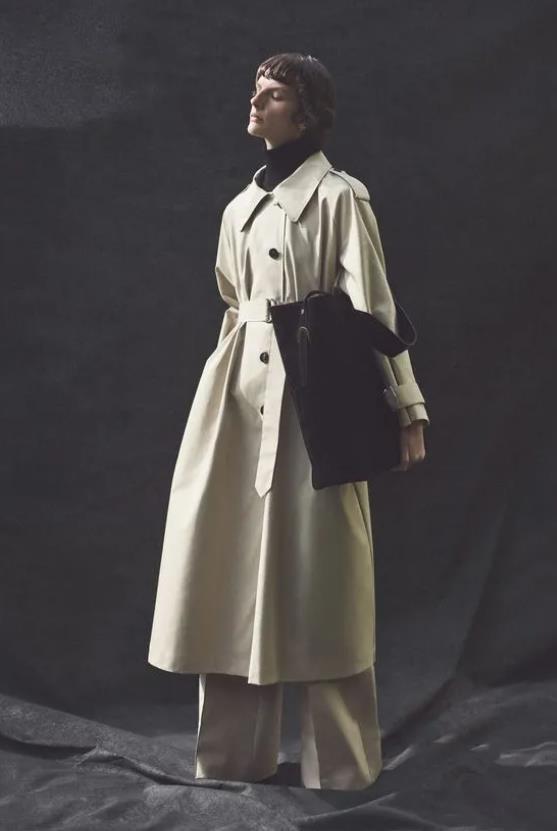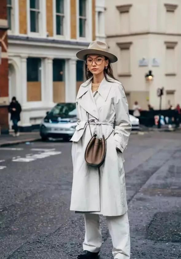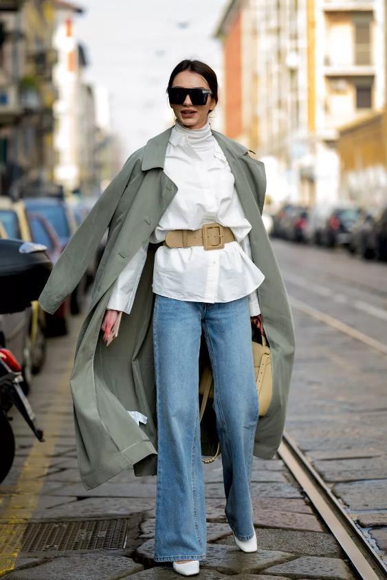 H版型的風衣外套,對於身材真的是毫無約束感,配以淺卡其色,也太不失個人氣質了,整個着裝營造出一種慵懶、高級又不失氣質感,選擇一條白色牛仔闊腿褲來配,瞬間就將大女人的氣質放大了,搭配一雙亮色高跟鞋,有種不經意的隨性和魅力。
