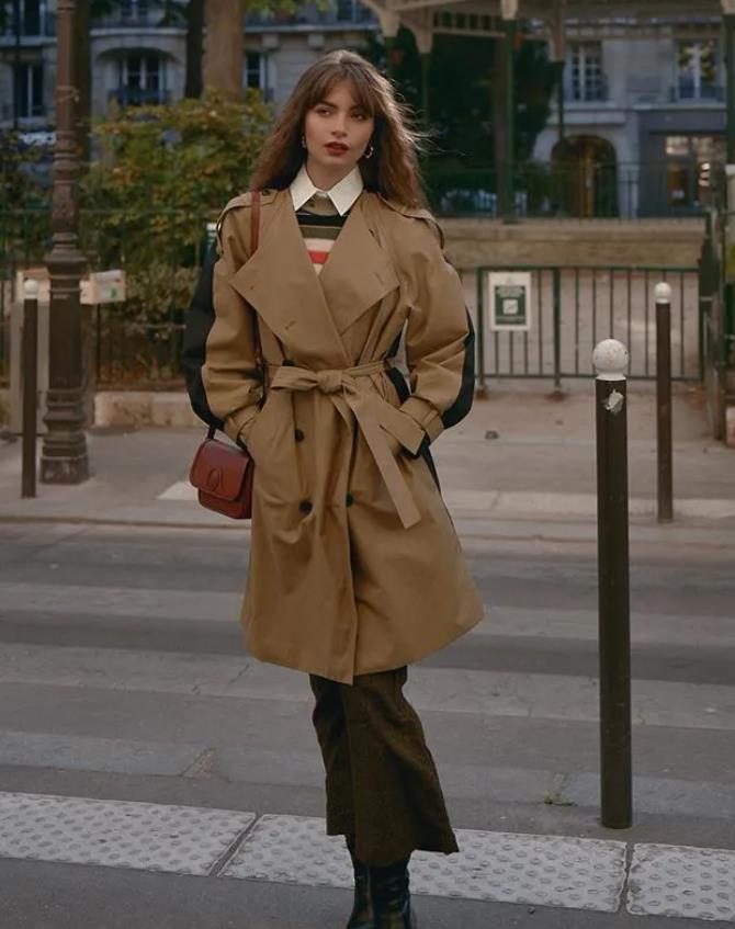 深卡其色的風衣,真的是最具氛圍感的了,內搭一件針織打底,再疊穿白色襯衫,這樣的疊穿方式,不僅增加層次感,還保證了穿着溫度。記得要把襯衫的領子露出來,搭配一條咖色闊腿褲,什麼場合都能hold住的搭配,再配上一雙黑色靴子,又颯又不失氣場。
