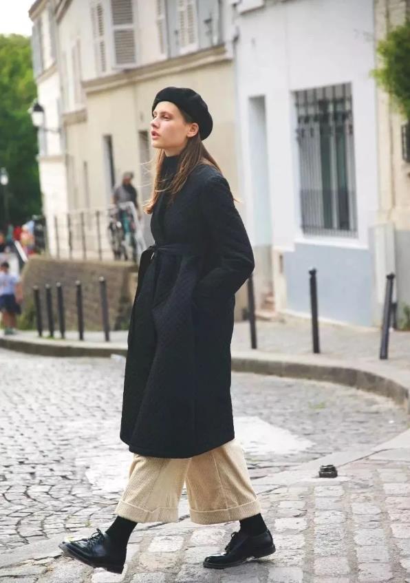 黑色的風衣,總是很百搭和不挑人的,也能在無形間散發出瀟灑與氣質,搭配一條淺咖色闊腿褲,休閒個性又能展現出個人魅力。搭配一雙黑色平底鞋,與黑色風衣進行了呼應,和諧度滿滿的。