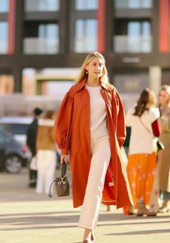 如果你擔心自己的秋冬着裝穿得太沉悶的話,那麼可以試試亮色的外套或者是單品,磚紅色風衣外套,內搭一件白色針織打底,內搭的顏色平衡了磚紅色的明豔,讓你的秋冬穿得很有魅力,也不失利落氣場,很瀟灑又帶着高級。