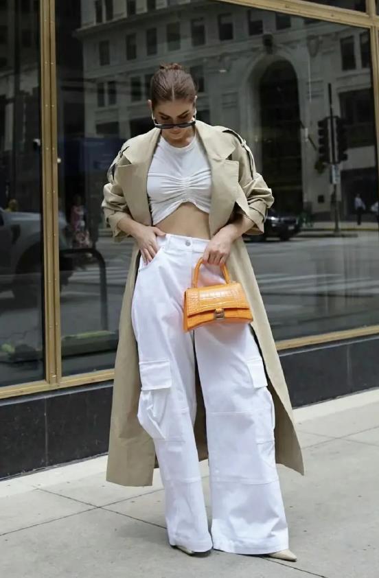 我想,在秋冬季節,大概沒有人會拒絕卡其色風衣的吧?內搭可以個性一點,借鑑一下博主們的穿法,選擇一件露腰的打底t恤,將女性的魅力完美呈現出來,再搭配一雙白色工裝闊腿褲,配上一雙尖頭平底鞋,魅力無限哦。
