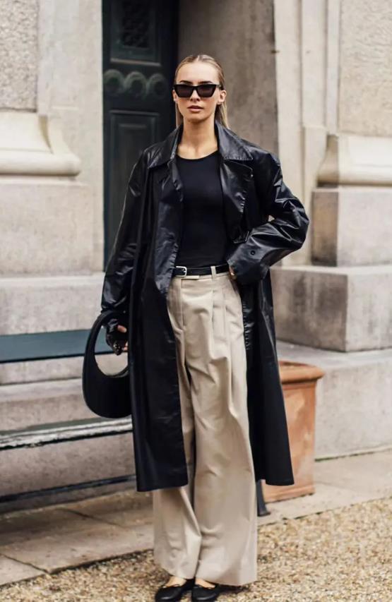 黑色的皮質風衣外套,穿起來可是超級拉風的,內搭一件與風衣顏色一致的打底衫,視覺上看起來就更顯瘦了,毫不費力就可以穿出時尚與高級。下身搭配一條淺卡其色闊腿褲,簡約又不失氣質,選擇一雙黑色平底鞋,又颯又不失氣場。