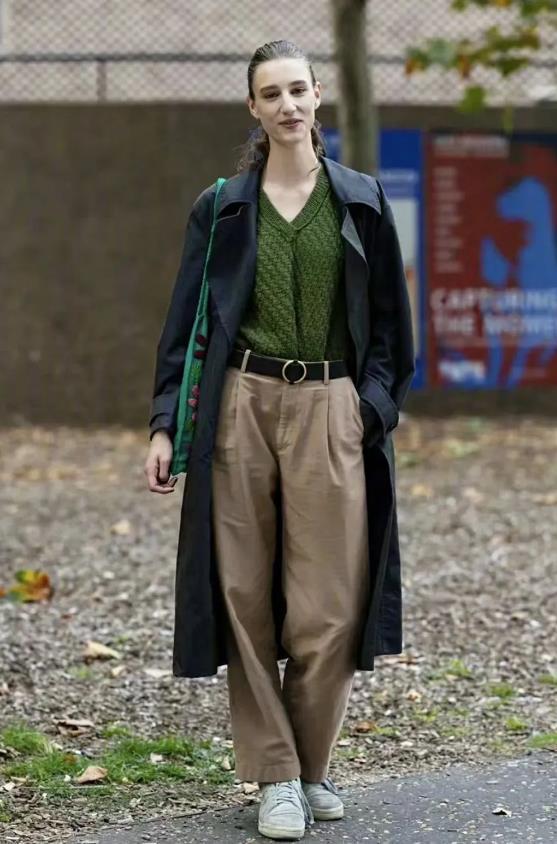 除了卡其色風衣之外,你還可以試試黑色風衣,這種經典顏色的風衣,也太百搭和時髦了,內搭一件綠色針織打底,輕鬆點綴了整個造型,風衣記得要敞開來穿,瞬間將大女人的氣場放大,穿得自在和灑脫,搭配一條卡其色闊腿褲,很大氣又不失魅力。