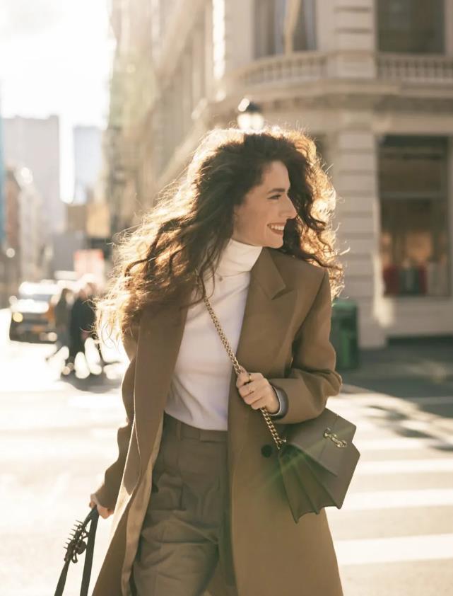 深咖色的西裝風衣外套,可以讓你穿出一種又颯又不失氣場的範,內搭一件白色高領打底衫,毫不費力就穿出大女人氣質,記得要把打底衫的衣角塞進褲子裏面,輕鬆提高腰線比例,還讓整個着裝造型看起來簡約利落。