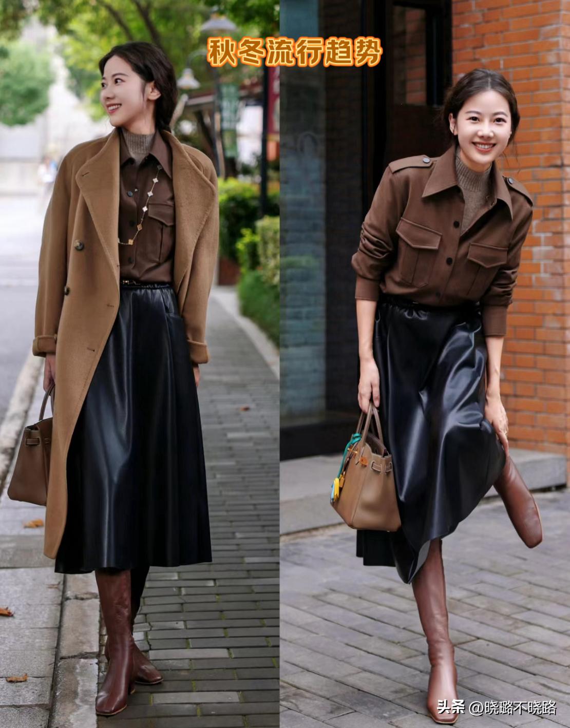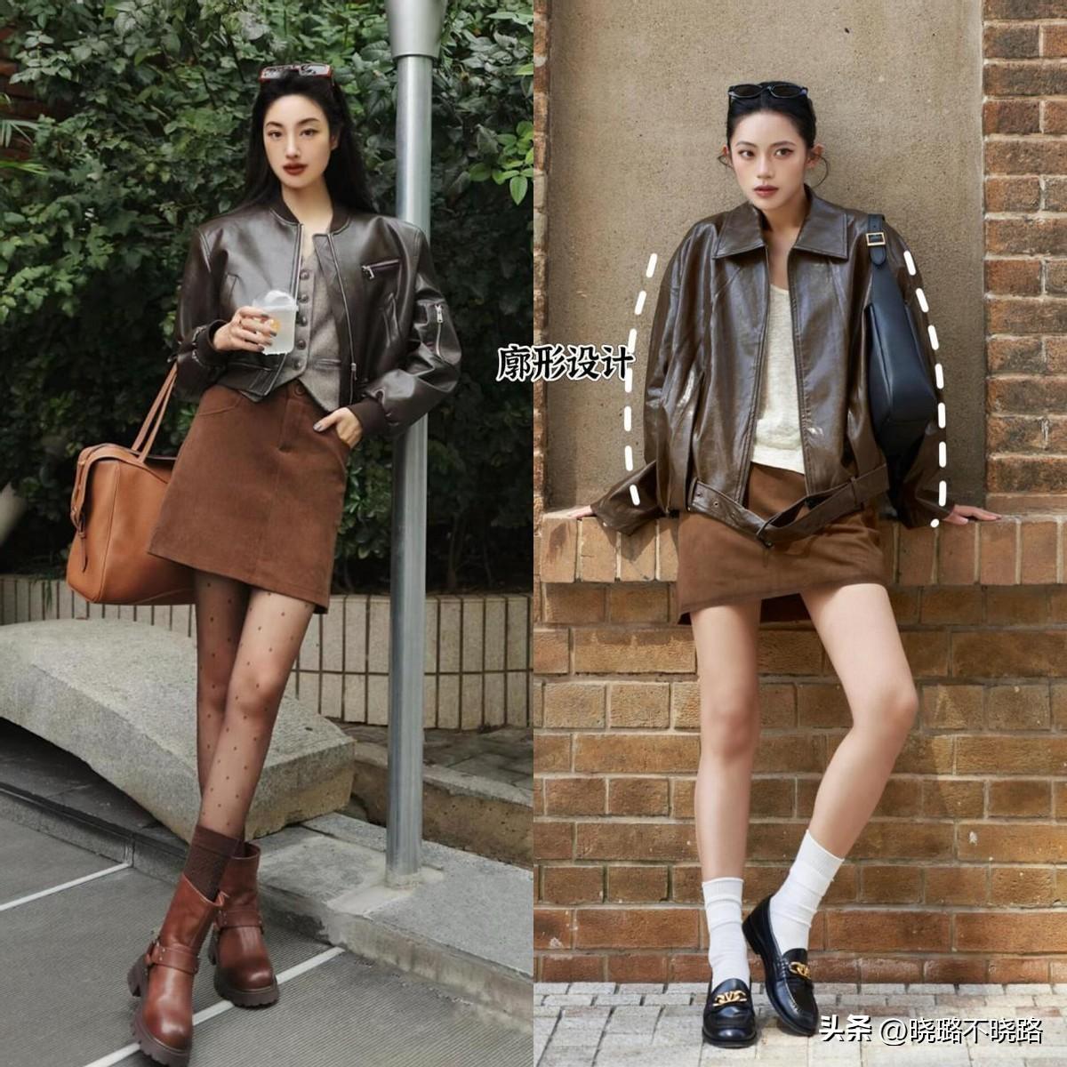 想要在秋天穿出又美又颯的效果,就千萬不要錯過皮衣,跟傳統的黑色修身皮衣比起來,今年秋冬更流行棕色廓形皮衣,搭配短裙潮流範兒十足。