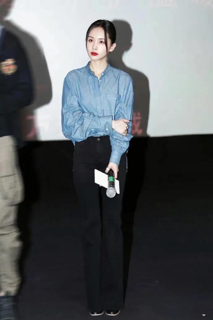 牛仔襯衫、黑色直筒褲,幹練有範。她挽起了長髮、畫上了紅脣,氣場全開、美得好驚豔。