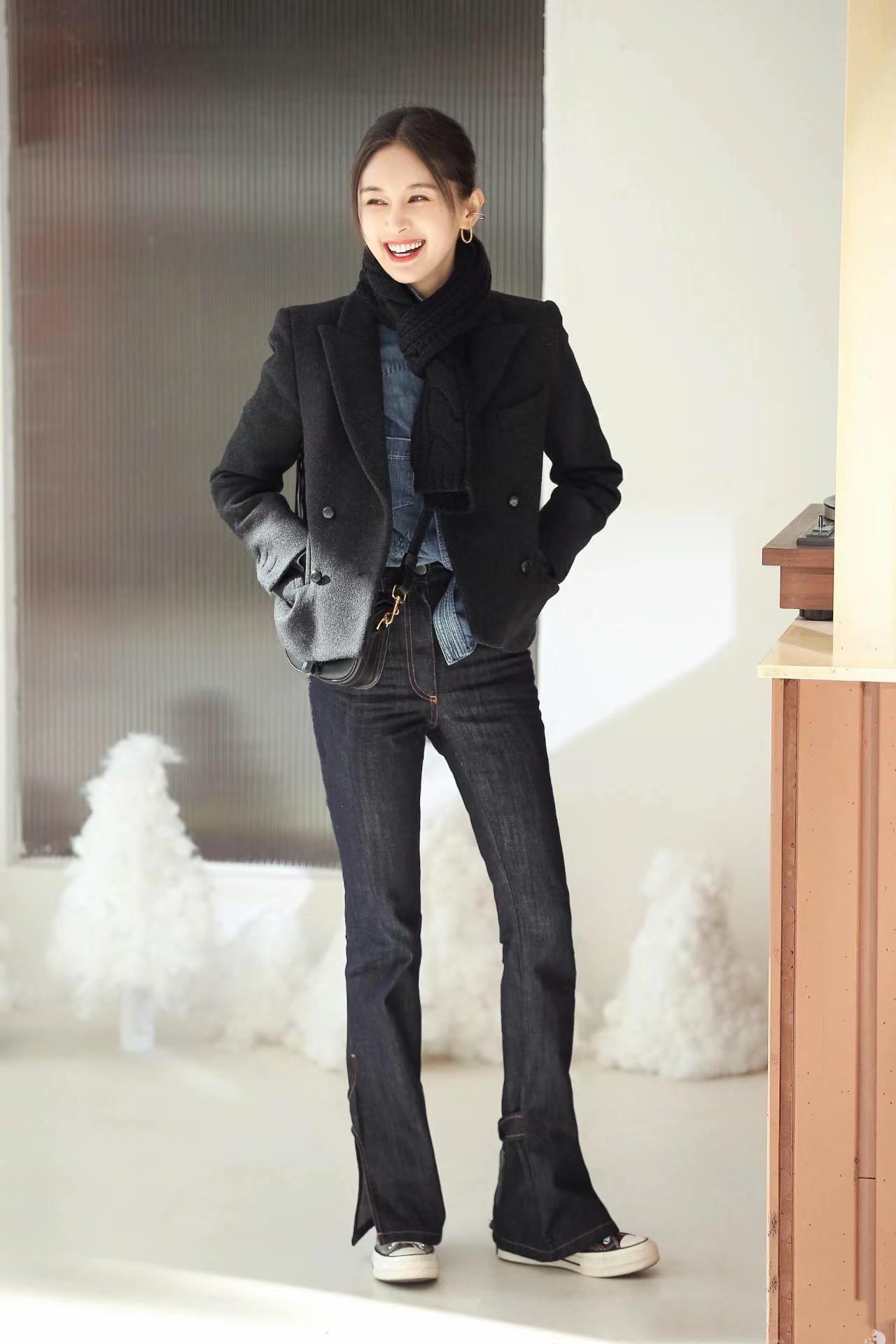 黑色毛呢西服,小短款設計,精神又大方,配一條高腰的微喇牛仔褲,高腰線更加醒目,搭配厚底帆布鞋,青春活力又顯高,王子文雖然個子不高、但比例是真的好。