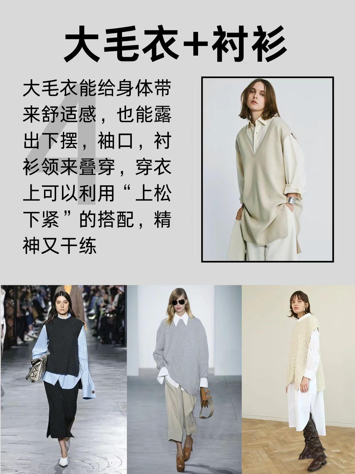不管是大毛衣、還是大馬甲,都應該秉承上松下緊的搭配,精神有幹練。內搭白襯衫,也可以選擇稍微寬鬆的大版型,更時髦灑脫。