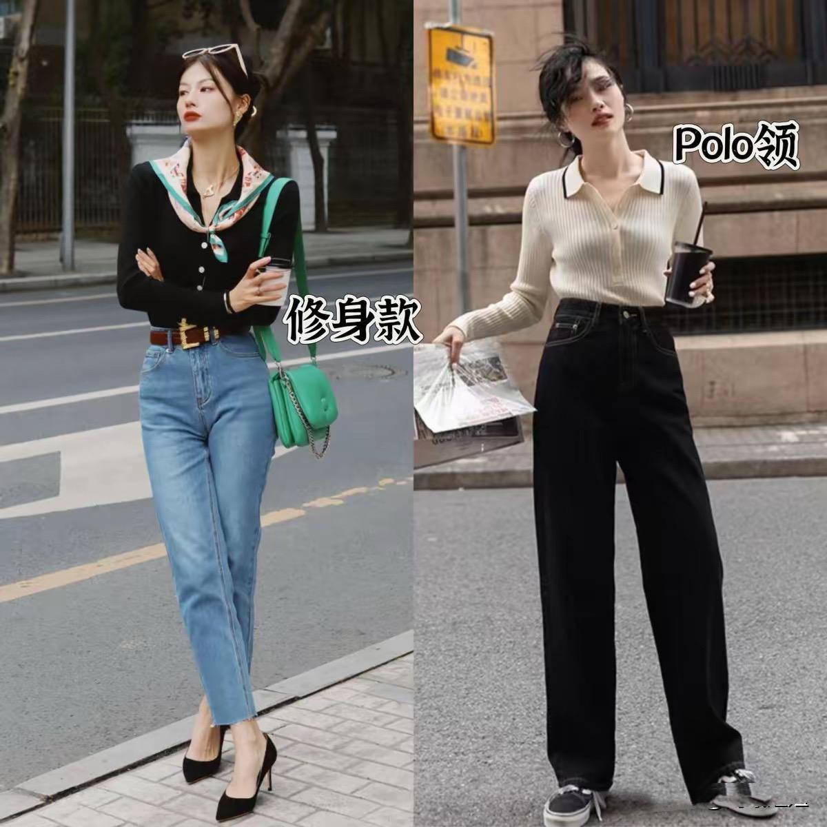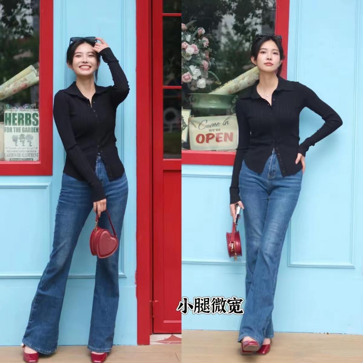 修身的黑色polo衫,配上高腰的微喇牛仔褲,簡簡單單的就很顯高。如果你想要大長腿的效果,可以配一雙高跟鞋,充分拉伸比例顯腿長。