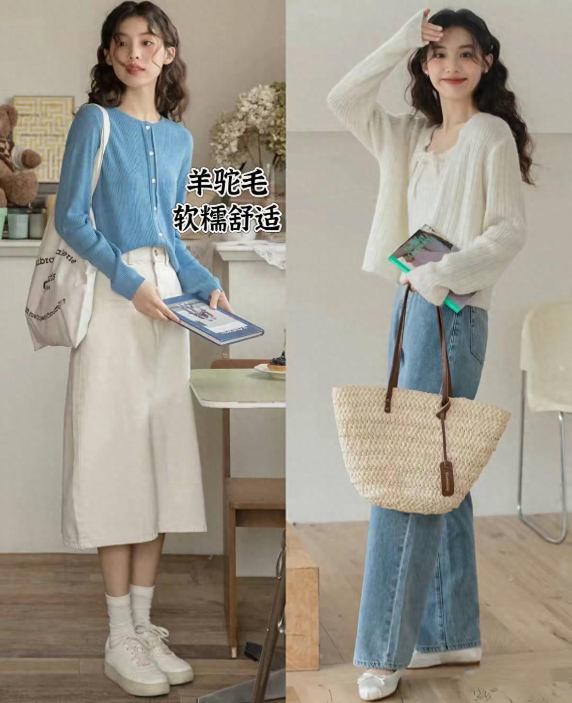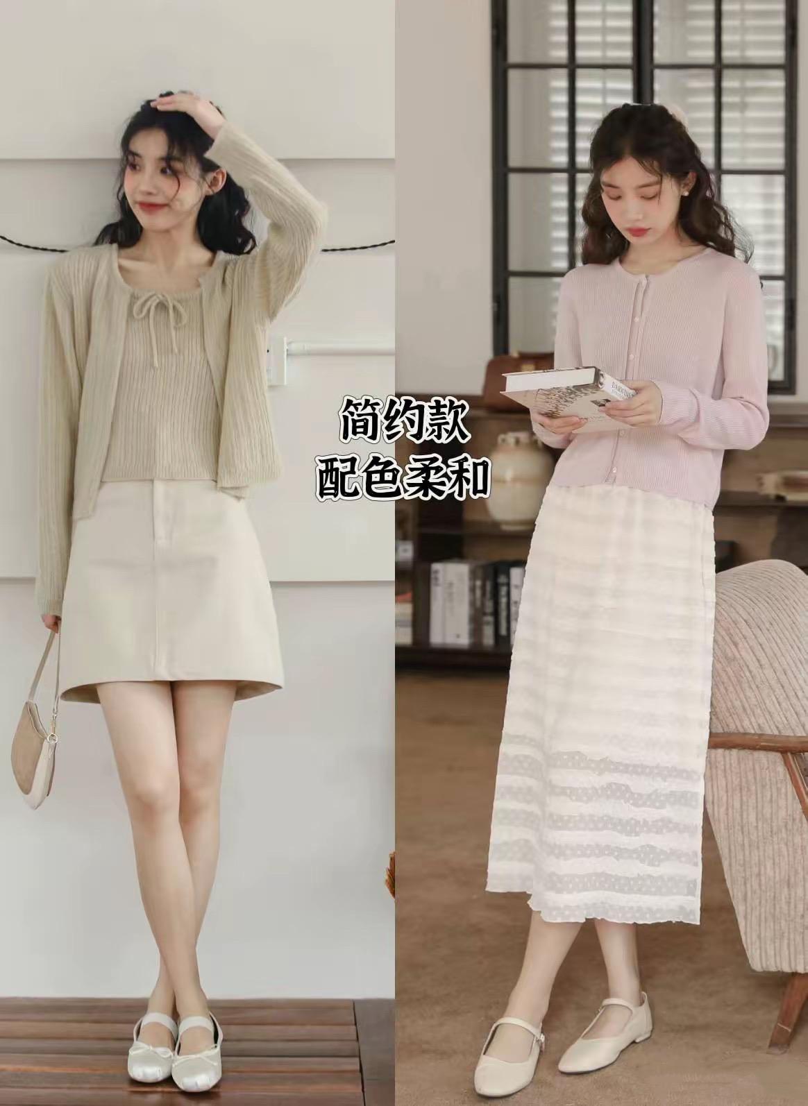 燕麥色的針織開衫、以及粉紫色的針織開衫,都格外的溫柔。款式簡約、穿起來不臃腫,更柔和自在。不管是配長裙、還是短裙,都格外的時尚。
